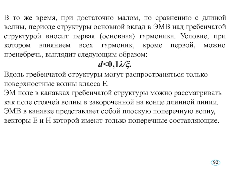 Строгий анализ показывает, что поле над гребенчатой структурой представляет собой суперпозицию поверхностных волн, поперечные коэффициенты затухания которых растут с увеличением номера гармоники и уменьшением периода структуры d.