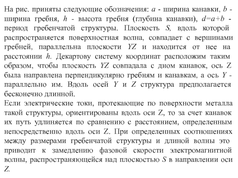 - период гребенчатой структуры. Плоскость S, вдоль которой распространяется поверхностная волна, совпадает с вершинами гребней, параллельна плоскости YZ и находится от нее на расстоянии h. Декартову систему координат расположим таким образом, чтобы плоскость YZ совпадала с дном канавок, ось Z была направлена перпендикулярно гребням и канавкам, а ось Y - параллельно им. Вдоль осей Y и Z структура предполагается бесконечно длинной.