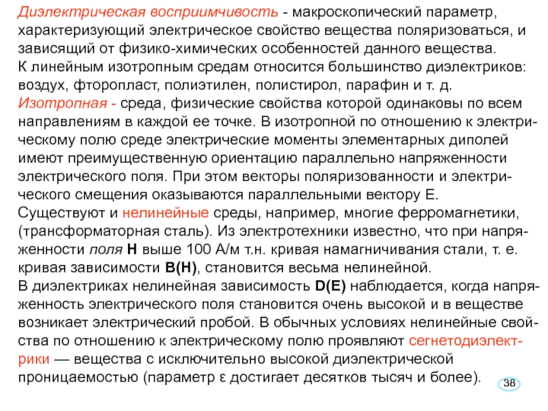 Слайд 38Диэлектрическая восприимчивость - макроскопический параметр, характеризующий электрическое свойство вещества поляризоваться,