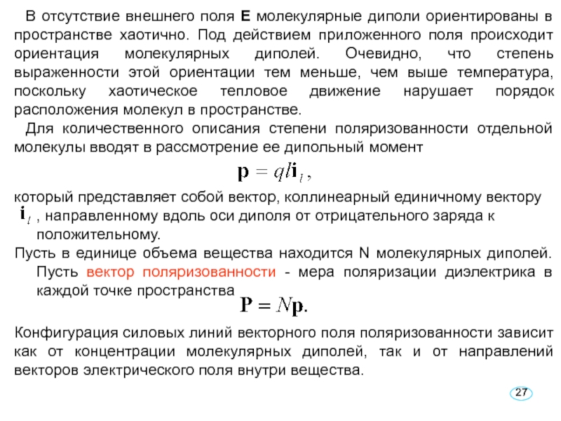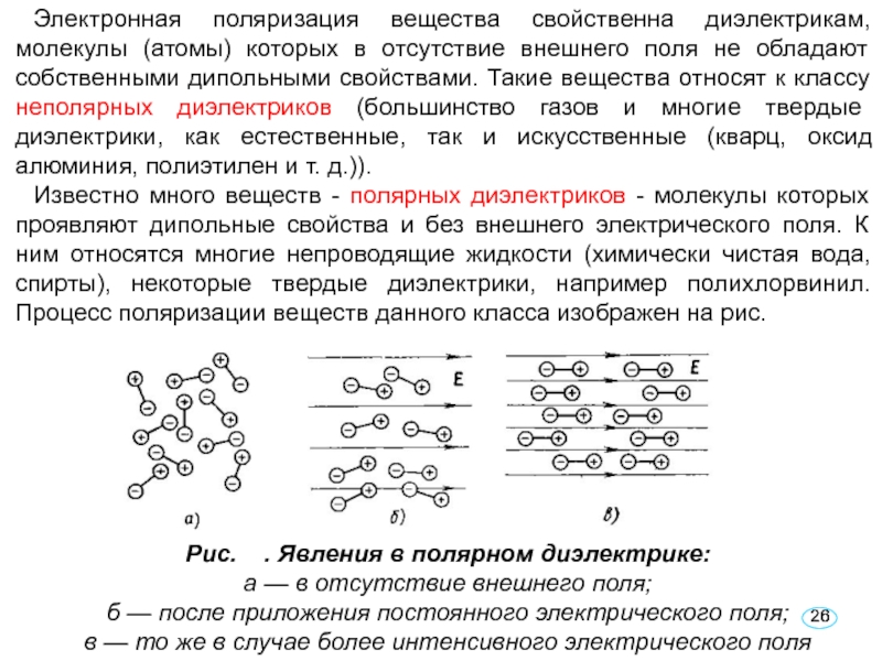 В отсутствие внешнего поля Е внутри рассматривае-мой области положительные и отрицательные заряды, входящие в молекулы, компенсируют друг друга, поэтому плотность электрического заряда