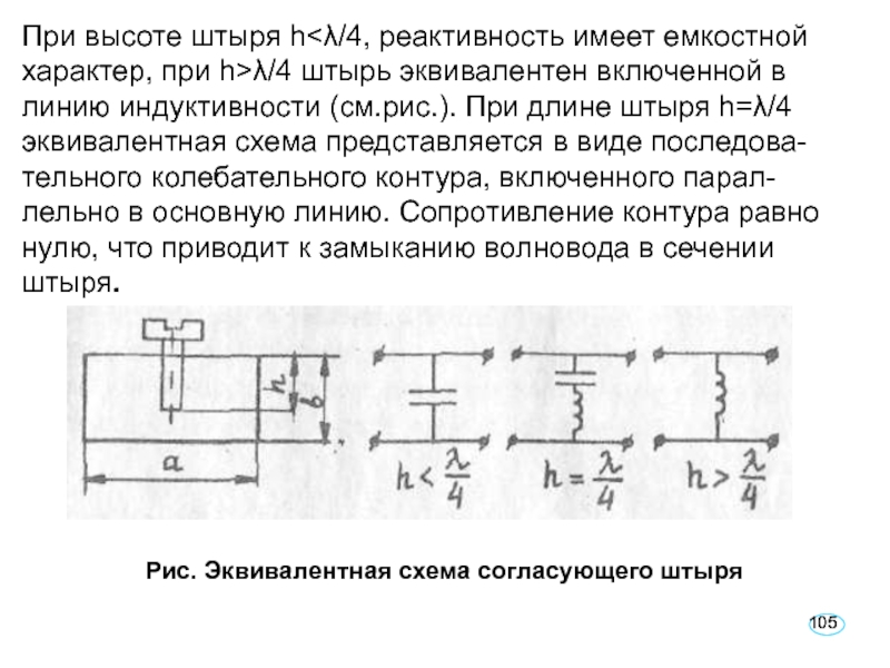 h=λ/4 эквивалентная схема представляется в виде последова- тельного колебательного контура, включенного парал- лельно в основную линию. Сопротивление контура равно нулю, что приводит к замыканию волновода в сечении штыря.