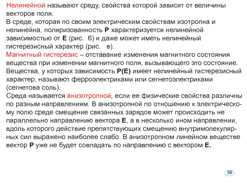 Слайд 39Нелинейной называют среду, свойства которой зависят от величины векторов поля.