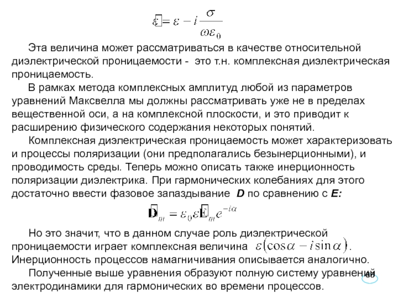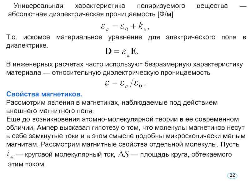 Для описания электромагнитных явлений в материальных средах необходимо располагать соотношениями, которые связывали бы попарно векторные поля Е и D, В и Н. Уравнения подобных связей называют материальными уравнениями. Их вывод должен опираться на микроскопическую (атомно-молекулярную) картину процессов, которые происходят в веществе под действием сил электромагнитного поля.