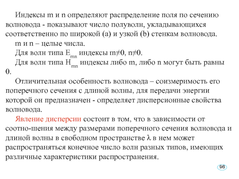 Слайд 96Индексы m и n определяют распределение поля по сечению волновода