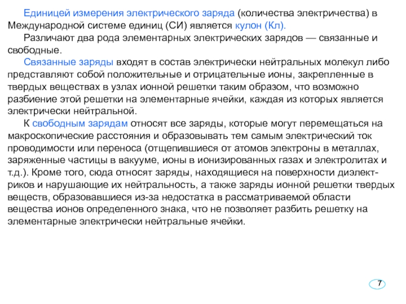 Слайд 7Единицей измерения электрического заряда (количества электричества) в Международной системе единиц