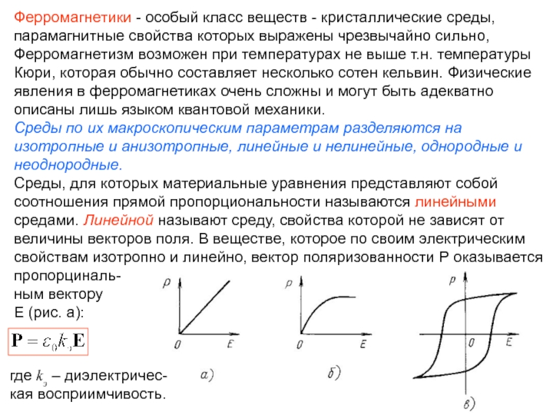 поляризованность Р характеризуется нелинейной зависимостью от Е (рис. б) и даже может иметь нелинейный гистерезисный характер (рис. в).