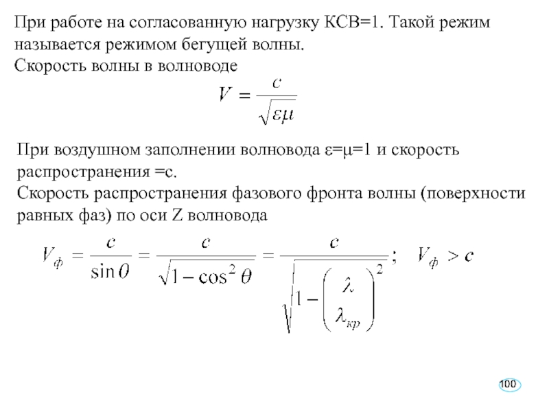 Слайд 100При работе на согласованную нагрузку КСВ=1. Такой режим называется режимом