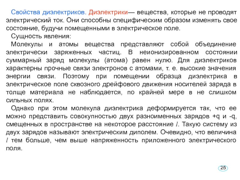 Слайд 25Свойства диэлектриков. Диэлектрики— вещества, которые не проводят электрический ток. Они