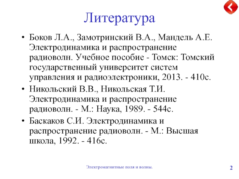 Никольский В.В., Никольская Т.И. Электродинамика и распространение радиоволн. - М.: Наука, 1989. - 544с.