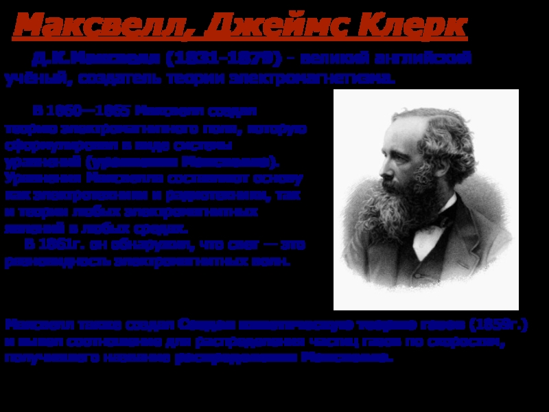 Д.К.Максвелл (1831-1879) - великий английский учёный, создатель теории электромагнетизма.