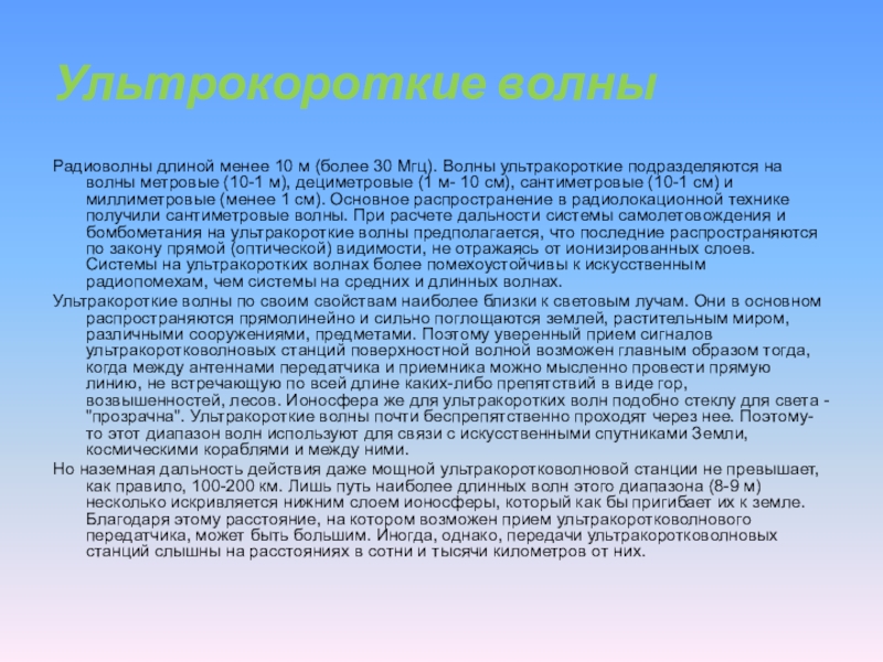 Радиоволны длиной менее 10 м (более 30 Мгц). Волны