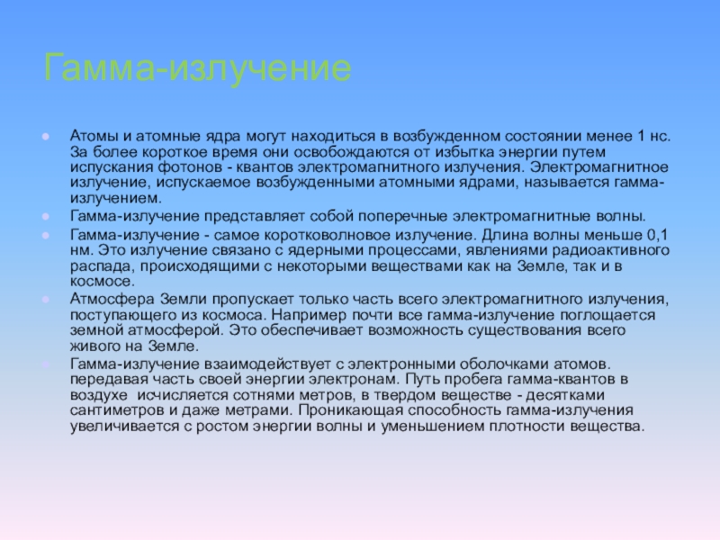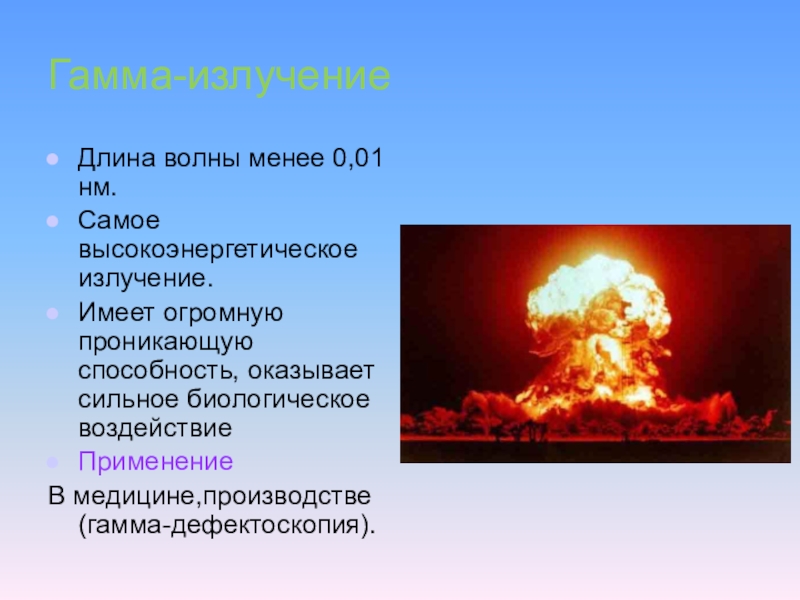 Гамма-излучение - самое коротковолновое излучение. Длина волны меньше 0,1 нм. Это излучение связано с ядерными процессами, явлениями радиоактивного распада, происходящими с некоторыми веществами как на Земле, так и в космосе.