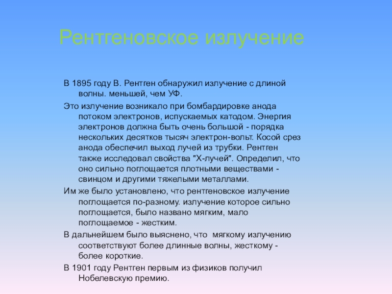 Им же было установлено, что рентгеновское излучение поглощается по-разному. излучение которое сильно поглощается, было названо мягким, мало поглощаемое - жестким.