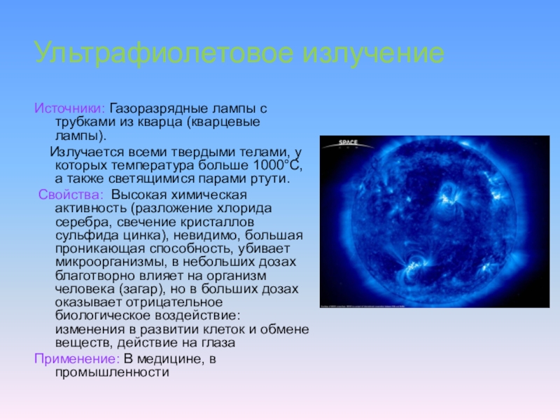 Свойства: Высокая химическая активность (разложение хлорида серебра, свечение кристаллов сульфида цинка), невидимо, большая проникающая способность, убивает микроорганизмы, в небольших дозах благотворно влияет на организм человека (загар), но в больших дозах оказывает отрицательное биологическое воздействие: изменения в развитии клеток и обмене веществ, действие на глаза