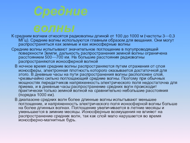 Средние волны испытывают значительное поглощение в полупроводящей поверхности Земли, дальность распространения земной волны ограничена расстоянием 500—700 км. На большие расстояния радиоволны распространяются ионосферной волной