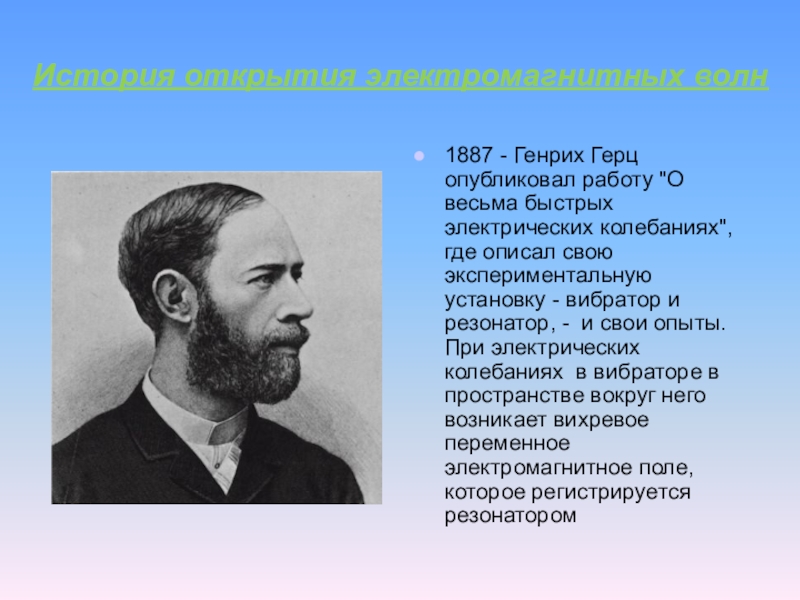 вибратор и резонатор, - и свои опыты. При электрических колебаниях в вибраторе в пространстве вокруг него возникает вихревое переменное электромагнитное поле, которое регистрируется резонатором