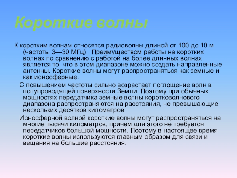 Ионосферной волной короткие волны могут распространяться на многие тысячи километров, причем для этого не требуется передатчиков большой мощности. Поэтому в настоящее время короткие волны используются главным образом для связи и вещания на большие расстояния.