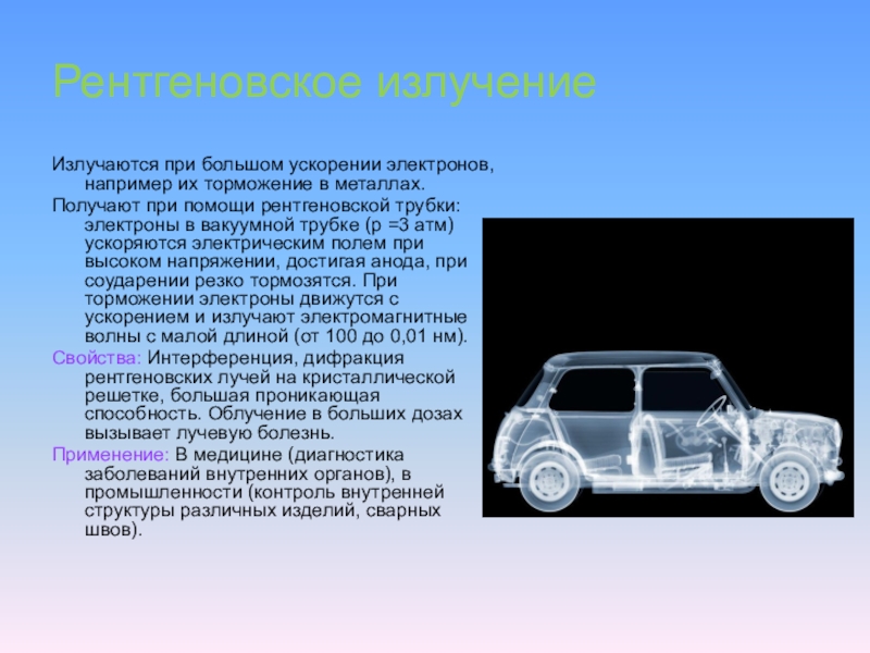 =3 атм) ускоряются электрическим полем при высоком напряжении, достигая анода, при соударении резко тормозятся. При торможении электроны движутся с ускорением и излучают электромагнитные волны с малой длиной (от 100 до 0,01 нм).