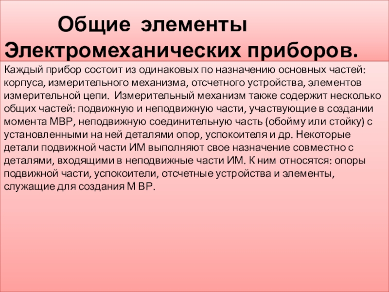 измерительной цепи. Измерительный механизм также содержит несколько общих частей: подвижную и неподвижную части, участвующие в создании момента МВР, неподвижную соединительную часть (обойму или стойку) с установленными на ней деталями опор, успокоителя и др. Некоторые детали подвижной части ИМ выполняют свое назначение совместно с деталями, входящими в неподвижные части ИМ. К ним относятся: опоры подвижной части, успокоители, отсчетные устройства и элементы, служащие для создания М ВР.