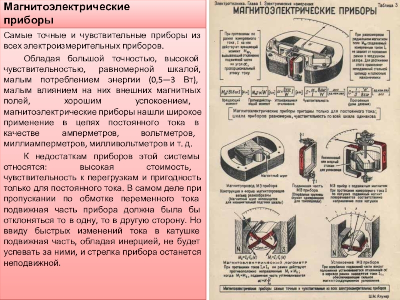 чувствительностью, равномерной шкалой, малым потреблением энергии (0,5—3 Вт), малым влиянием на них внешних магнитных полей, хорошим успокоением, магнитоэлектрические приборы нашли широкое применение в цепях постоянного тока в качестве амперметров, вольтметров, миллиамперметров, милливольтметров и т. д.