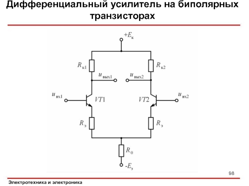 Слайд 98Дифференциальный усилитель на биполярных транзисторах