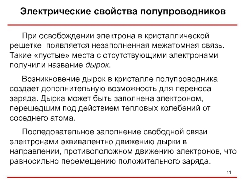 Возникновение дырок в кристалле полупроводника создает дополнительную возможность для переноса заряда. Дырка может быть заполнена электроном, перешедшим под действием тепловых колебаний от соседнего атома.