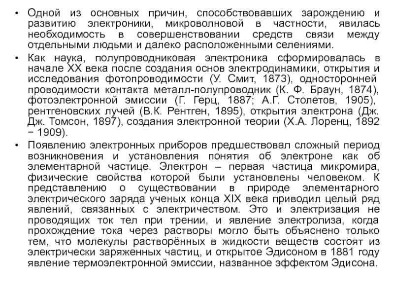 Появлению электронных приборов предшествовал сложный период возникновения и установления понятия об электроне как об элементарной частице. Электрон – первая частица микромира, физические свойства которой были установлены человеком. К представлению о существовании в природе элементарного электрического заряда ученых конца XIX века приводил целый ряд явлений, связанных с электричеством. Это и электризация не проводящих ток тел при трении, и явление электролиза, когда прохождение тока через растворы могло быть объяснено только тем, что молекулы растворённых в жидкости веществ состоят из электрически заряженных частиц, и открытое Эдисоном в 1881 году явление термоэлектронной эмиссии, названное эффектом Эдисона.