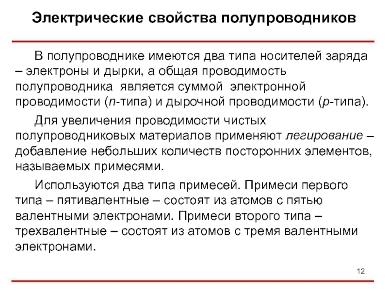 Для увеличения проводимости чистых полупроводниковых материалов применяют легирование – добавление небольших количеств посторонних элементов, называемых примесями.