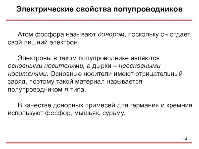 дырки – неосновными носителями. Основные носители имеют отрицательный заряд, поэтому такой материал называется полупроводником n-типа.