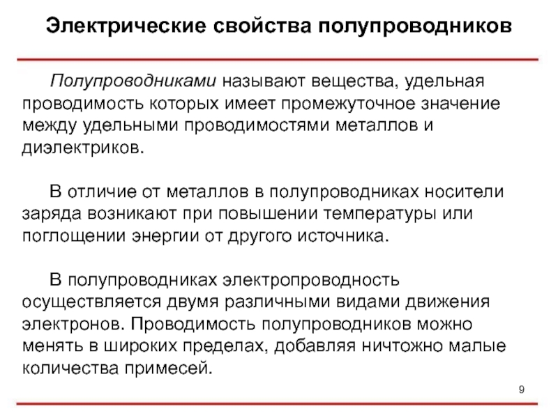 В полупроводниках электропроводность осуществляется двумя различными видами движения электронов. Проводимость полупроводников можно менять в широких пределах, добавляя ничтожно малые количества примесей.