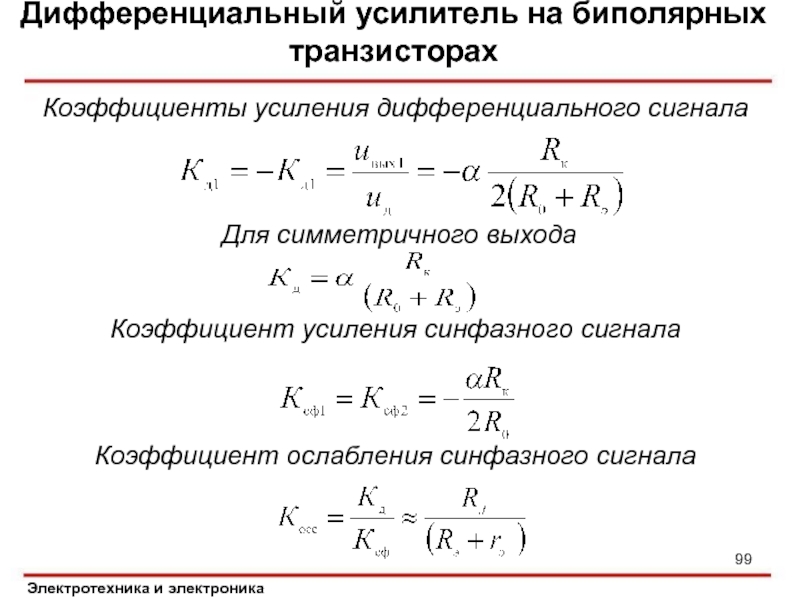 Слайд 99Дифференциальный усилитель на биполярных транзисторах