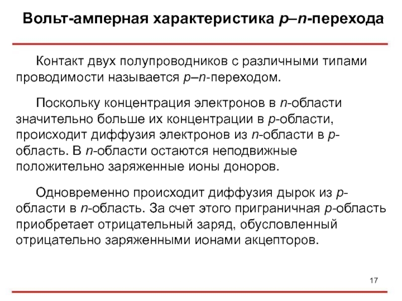 в p-области, происходит диффузия электронов из n-области в p-область. В n-области остаются неподвижные положительно заряженные ионы доноров.