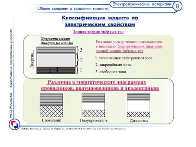 С точки зрения зонной теории твердого тела деление твердых тел на металлы, полупроводники и диэлектрики производят, исходя из ширины запрещенной зоны и степени заполнения разрешенных энергетических зон.