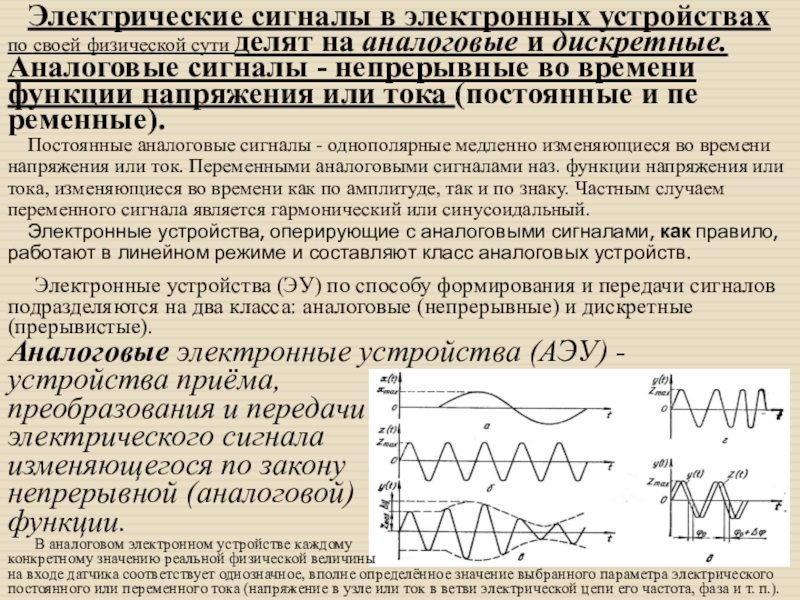 Электрические сигналы в электронных устройствах по своей физической сути делят на аналоговые и дискретные. Аналоговые сигналы - непрерывные во времени функции напряжения или тока (постоянные и переменные).