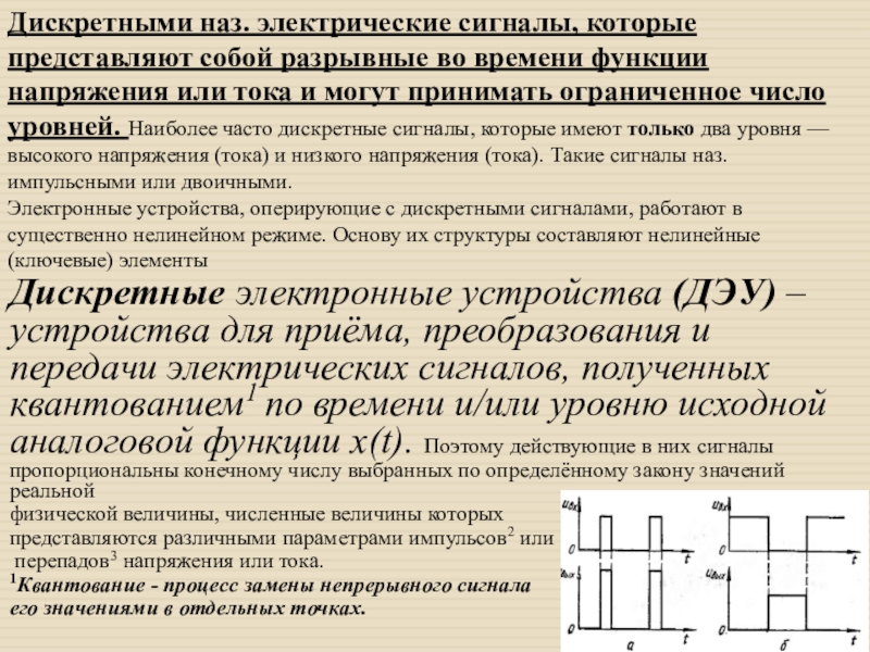 Дискретными наз. электрические сигналы, которые представляют собой разрывные во времени функции напряжения или тока и могут принимать ограниченное число уровней. Наиболее часто дискретные сигналы, которые имеют только два уровня — высокого напряжения (тока) и низкого напряжения (тока). Такие сигналы наз. импульсными или двоичными.
