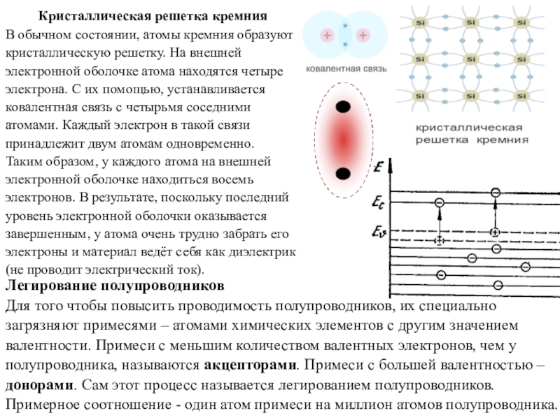 В обычном состоянии, атомы кремния образуют кристаллическую решетку. На внешней электронной оболочке атома находятся четыре электрона. С их помощью, устанавливается ковалентная связь с четырьмя соседними атомами. Каждый электрон в такой связи принадлежит двум атомам одновременно.