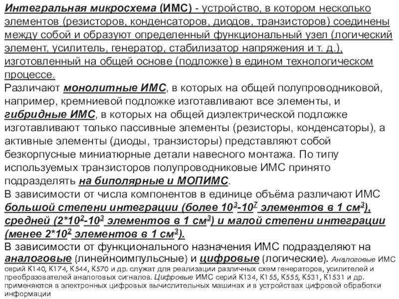 Слайд 69Интегральная микросхема (ИМС) - устройство, в котором несколько элементов (резисторов,