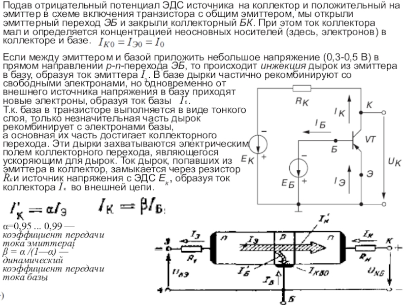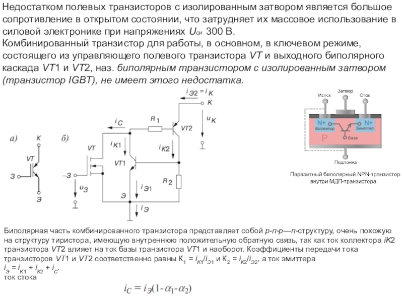 Биполярная часть комбинированного транзистора представляет собой р-п-р—п-структуру, очень похожую на структуру тиристора, имеющую внутреннюю положительную обратную связь, так как ток коллектора iK2 транзистора VT2 влияет на ток базы транзистора VT1 и наоборот. Коэффициенты передачи тока транзисторов VT1 и VT2 соответственно равны К1 = iK1/iЭ1 и К2 = iK2/iЭ2, а ток эмиттера