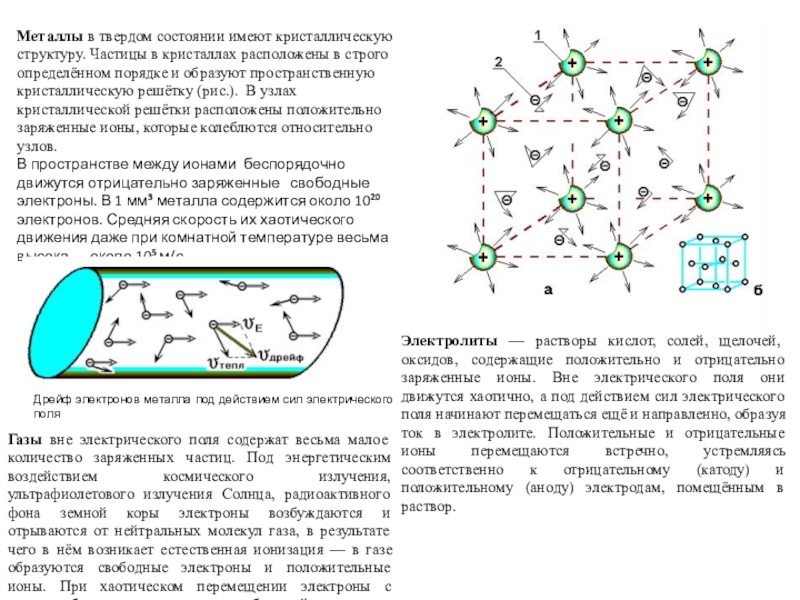 В пространстве между ионами беспорядочно движутся отрицательно заряженные свободные электроны. В 1 мм3 металла содержится около 1020 электронов. Средняя скорость их хаотического движения даже при комнатной температуре весьма высока — около 105 м/с