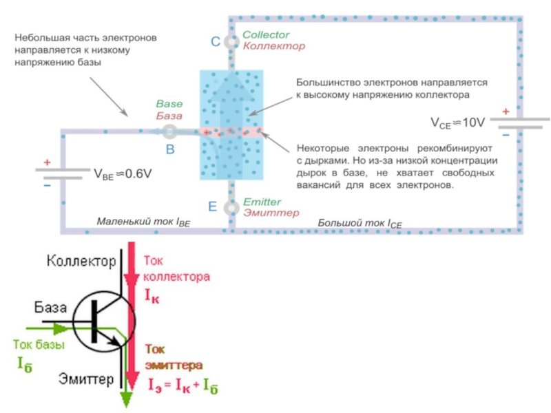 коллектор-эмиттер. Изменяя в небольших пределах малое напряжение, поданное на базу,