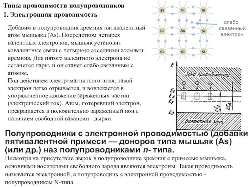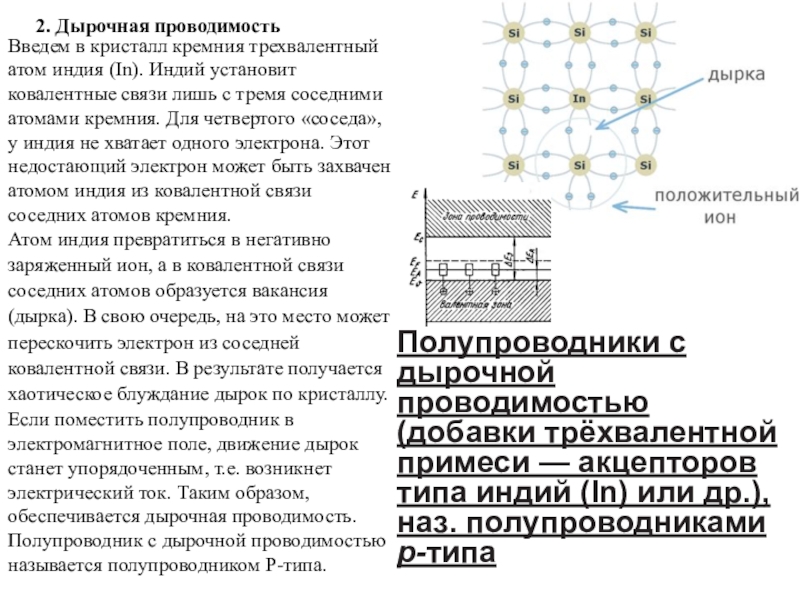 валентности. Примеси с меньшим количеством валентных электронов, чем у полупроводника, называются акцепторами. Примеси с большей валентностью – донорами. Сам этот процесс называется легированием полупроводников. Примерное соотношение - один атом примеси на миллион атомов полупроводника.