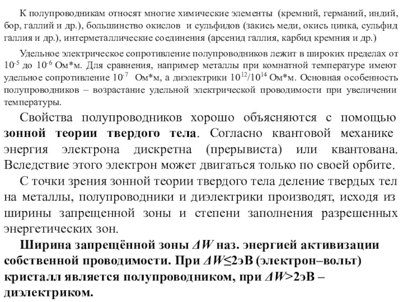 Полупроводники по способности проводить электрический ток занимают промежуточное положение между проводниками и изоляторами: их удельная электрическая проводимость мала для того, чтобы считать их проводниками, но слишком велика, чтобы использовать их как изоляторы. Под действием электрического поля, света, температуры, механических сил и др. Широко использются для изготовления диодов, транзисторов, фоторезисторов и фотоэлементов, терморезисторов и других полупроводниковых приборов, входящих в состав элементной базы современной вычислительной техники, электронной аппаратуры автоматического контроля и регулирования параметров и режимов технологических процессов. 10-5 до 10-6 Ом*м