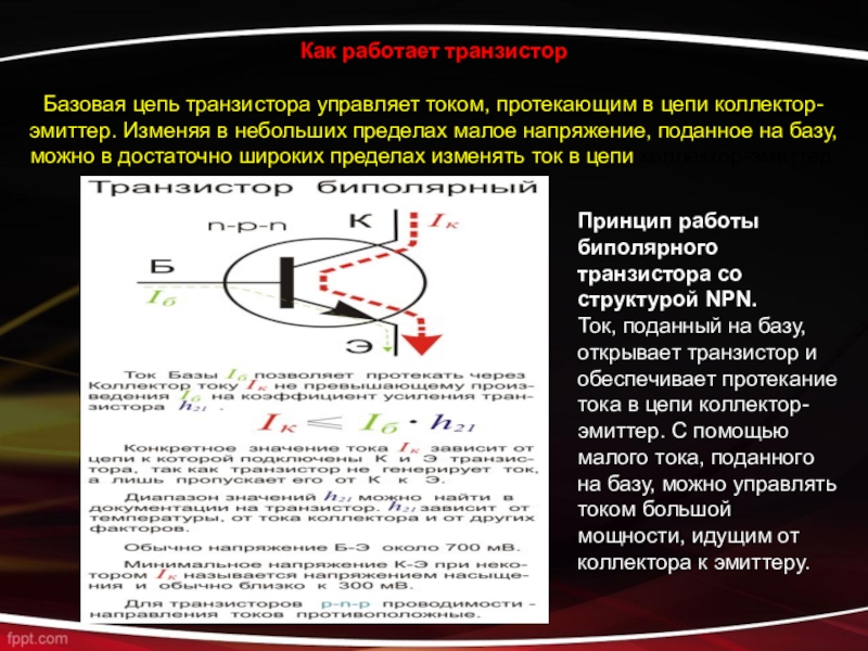 Ток, поданный на базу, открывает транзистор и обеспечивает протекание тока в цепи коллектор-эмиттер. С помощью малого тока, поданного на базу, можно управлять током большой мощности, идущим от коллектора к эмиттеру.