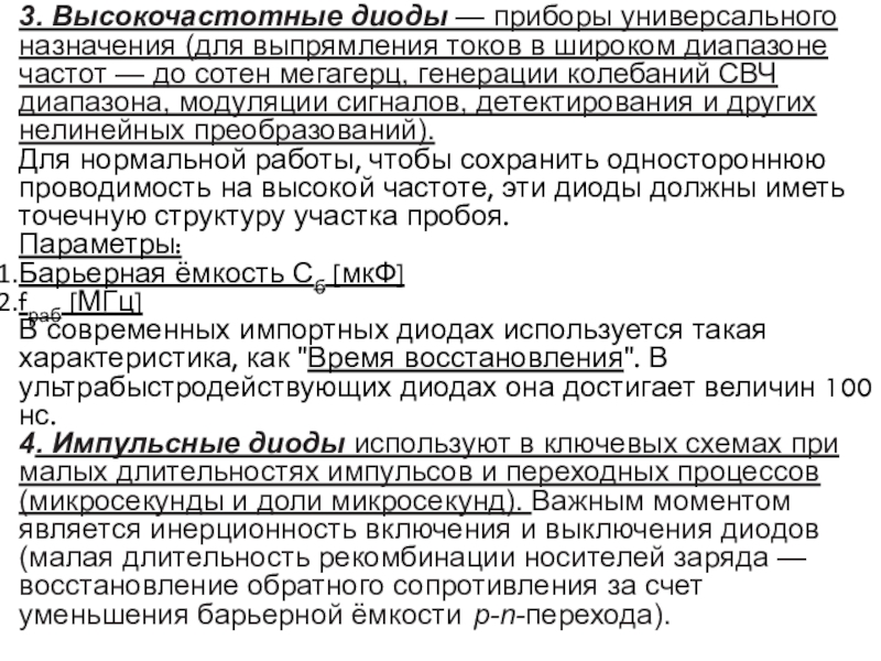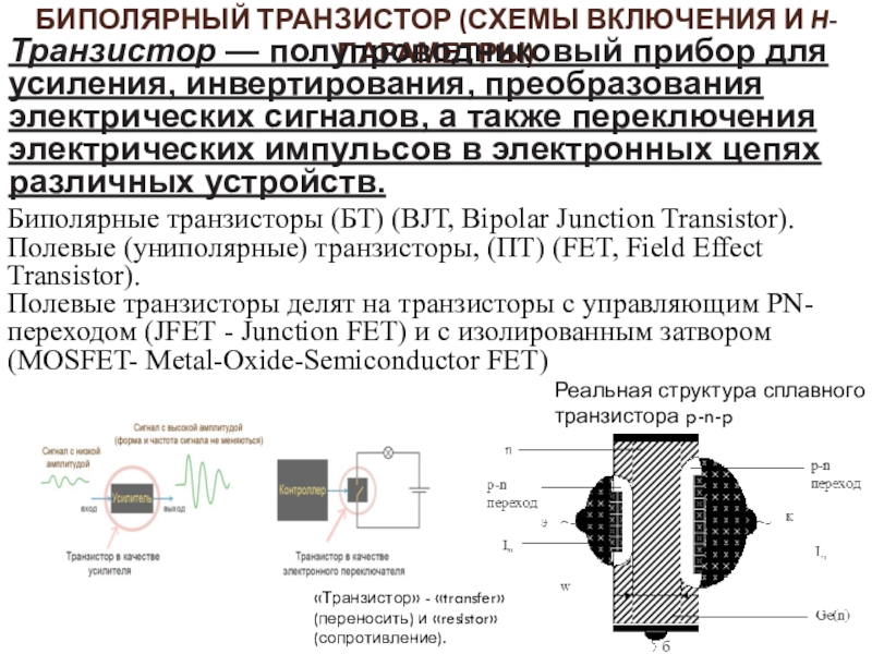 полупроводниковые диоды; биполярный транзистор (схемы включения и h-параметры); типы полевых