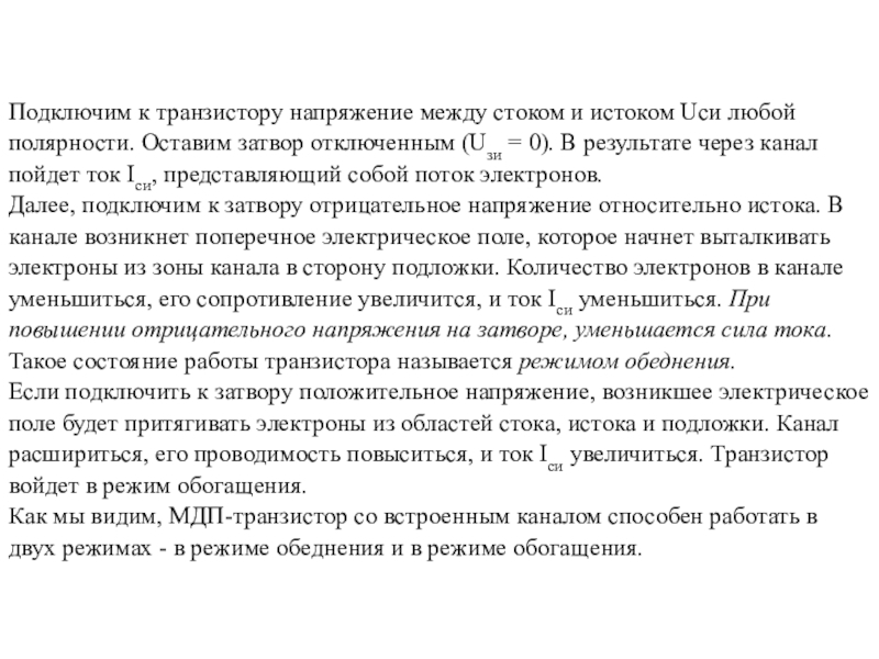 Далее, подключим к затвору отрицательное напряжение относительно истока. В канале возникнет поперечное электрическое поле, которое начнет выталкивать электроны из зоны канала в сторону подложки. Количество электронов в канале уменьшиться, его сопротивление увеличится, и ток Iси уменьшиться. При повышении отрицательного напряжения на затворе, уменьшается сила тока. Такое состояние работы транзистора называется режимом обеднения.