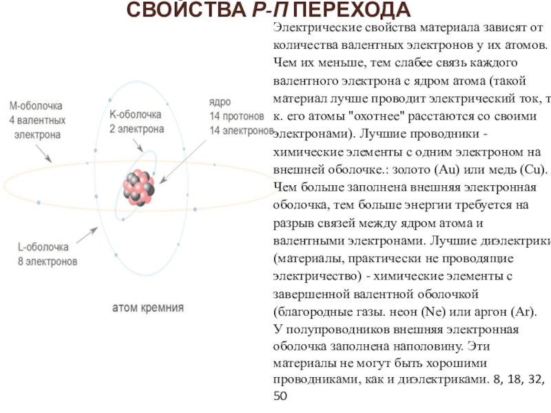 У полупроводников внешняя электронная оболочка заполнена наполовину. Эти материалы не могут быть хорошими проводниками, как и диэлектриками. 8, 18, 32, 50