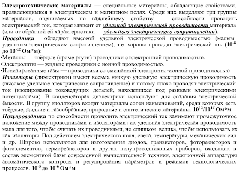 по важнейшему свойству — способности проводить электрический ток, которая зависит от удельной электрической проводимости материала (или от обратной ей характеристики — удельного электрического сопротивления).