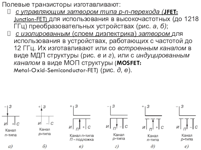 с изолированным (слоем диэлектрика) затвором для использования в устройствах, работающих с частотой до 12 ГГц. Их изготавливают или со встроенным каналом в виде МДП структуры (рис. в и г), или с индуцированным каналом в виде МОП структуры (MOSFET: Metal-Oxid-Semiconductor-FET) (рис. д, е).