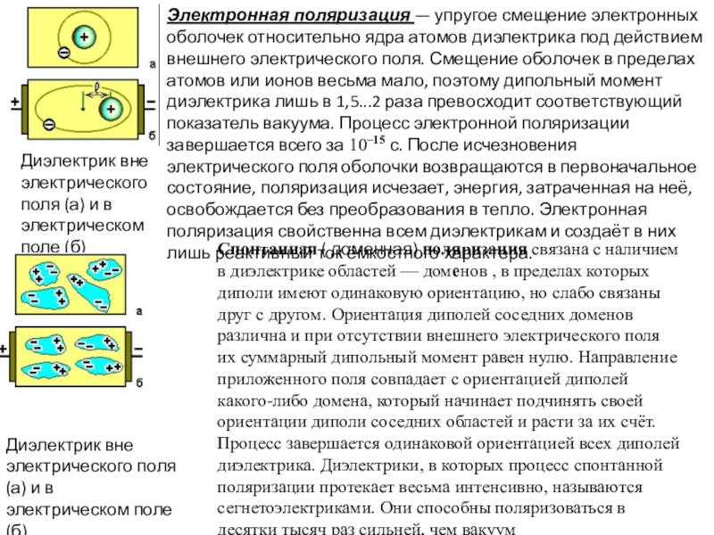 атомов или ионов весьма мало, поэтому дипольный момент диэлектрика лишь в 1,5...2 раза превосходит соответствующий показатель вакуума. Процесс электронной поляризации завершается всего за 1015 с. После исчезновения электрического поля оболочки возвращаются в первоначальное состояние, поляризация исчезает, энергия, затраченная на неё, освобождается без преобразования в тепло. Электронная поляризация свойственна всем диэлектрикам и создаёт в них лишь реактивный ток ёмкостного характера.
