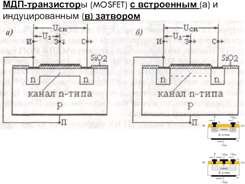 Слайд 60МДП-транзисторы (MOSFET) с встроенным (а) и индуцированным (в) затвором